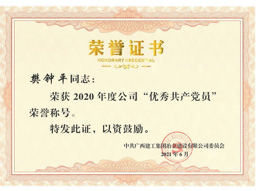 樊钟平被评为2020年度冶建公司优秀共产党员