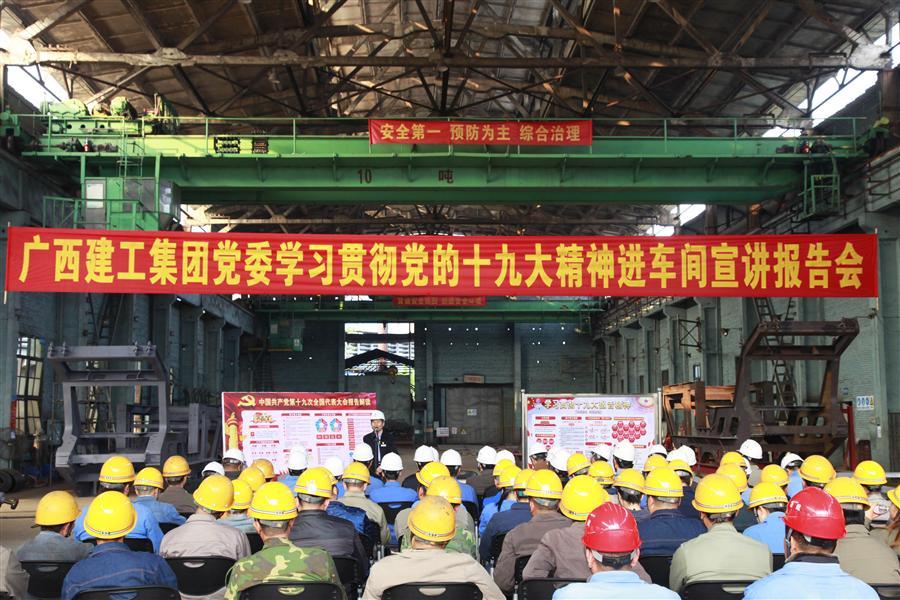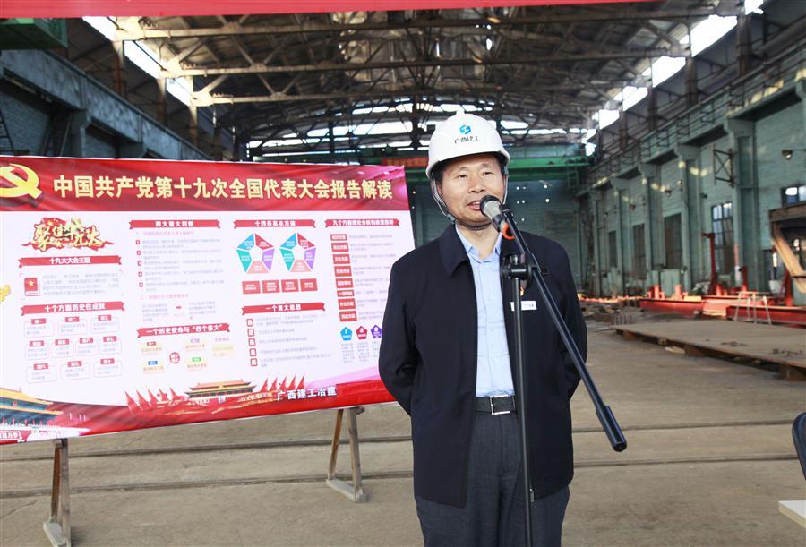 12月6日下午,广西建工集团党委委员、副总经理侯立林到冶建公司压力容器制造厂铆焊车间进行学习贯彻党的十九大精神进工地、进车间宣讲报告。