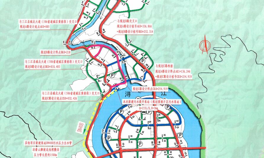 该项目位于柳州市三江侗族自治县黄排片区,结合规划区发展的功能需求,围绕着三江县新三江中学学校地块,规划形成“一带、一环、四心、五轴、七片”的城市结构体系与“山、水、城、田、人”相融的组团城市格局。“一带”指自东向西贯穿城区的浔江风情带,连接县城多个片区;“一环”是由浔江大道-侗乡大道-河西老城西环线-宜阳大道构成的城市环线;“四心”分别是指浔江半岛行政文体中心、河东侗乡民族文化中心、大洲岛旅游活动中心和火车南站客运枢纽中心;“五轴”分别是指连接到城市环线的桂三高速公路连接线、209 国道周坪段、321 国道周坪段、龙吉大道和三柳高速公路程村连接线;“七片”则分别是指黄排片区、河西老城片区、河东新城片区(含浔江半岛)、周坪片区、大洲岛片区、龙吉片区和火车南站片区。