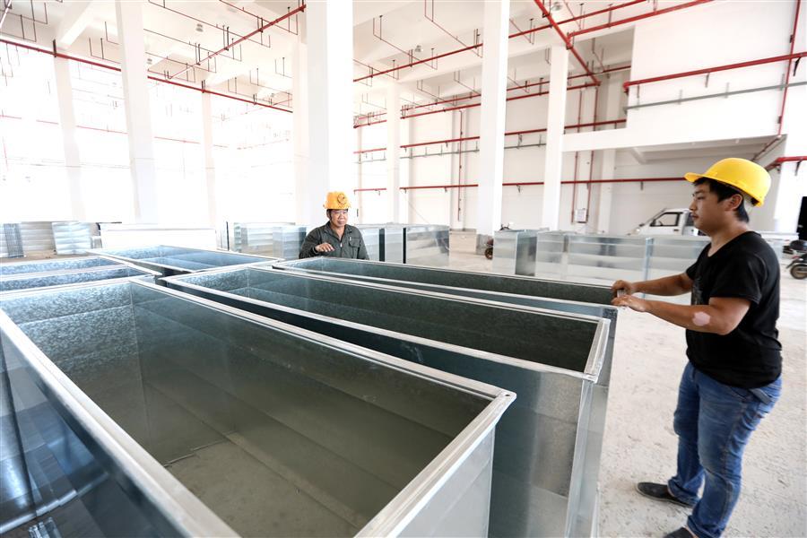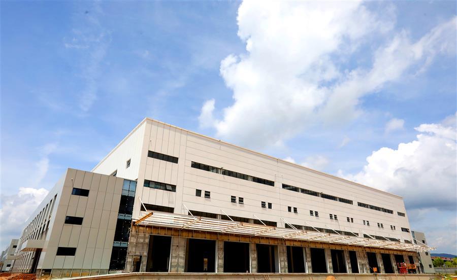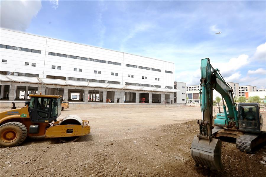 该项目负责人莫剑生介绍,仓储配一体库主要建设6栋库房,目前项目主体基本建成,正紧张有序收尾。为了加快项目进度,项目部在做好防暑降温、安全施工等保障措施的同时,采取多班组、多工种在不同的库房交叉作业,目前工地上有七八个班组在施工,施工内容包括外立面、挡雨棚、通风管、地面硬化施工等。