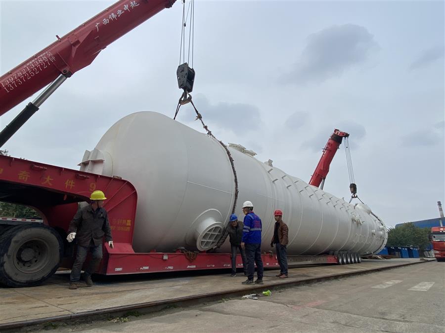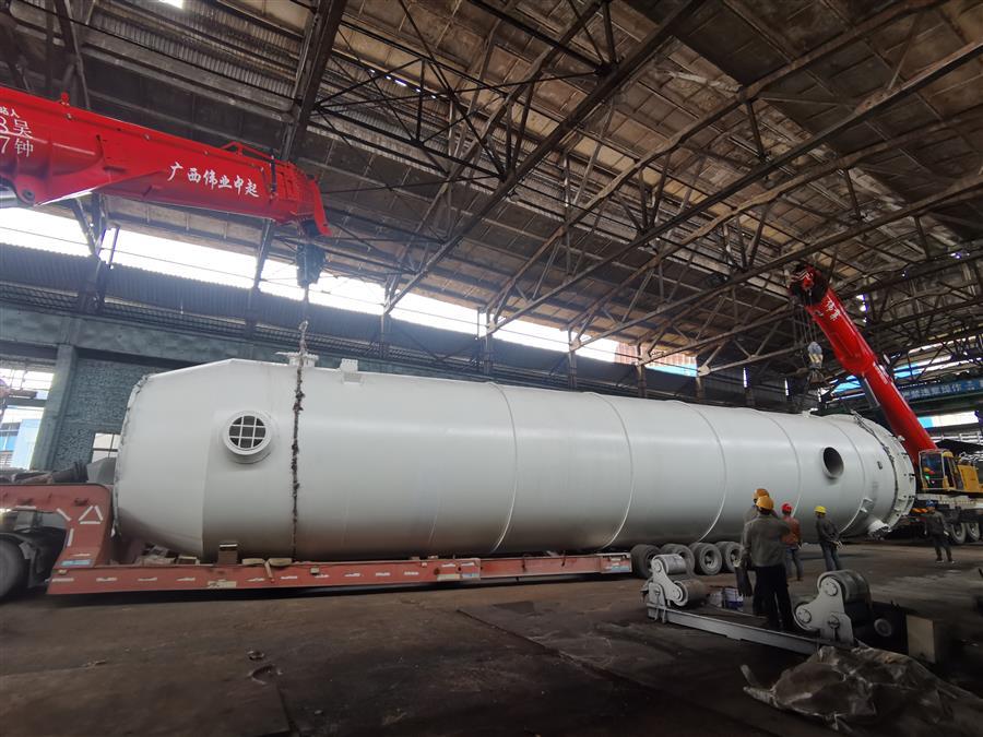 制造过程中,压力容器制造厂在项目制造周期短、施工人力资源紧张的情况下,认真组织技术骨干进行施工,全力以赴顺利按需完成了项目的交付任务。其中,空冷塔容积直径4.2m,高(长)28.3m,重量约65吨;水冷塔直径4.2m,长22.1m,重量约40吨。
