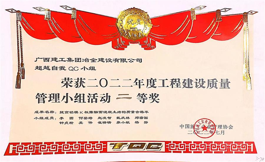 《提高预制混凝土箱涵顶进轴线偏差合格率》《提高混凝土外墙穿墙螺栓孔封堵施工合格率》荣获2022年广西工程建设质量管理小组活动成果三类成果。