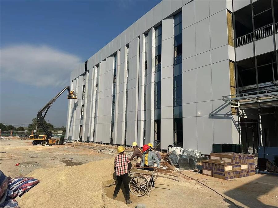 目前,项目1#联合厂房外立面均已完成,室内消防、钢结构等均已安装完毕,暖通以及水电工程、室内灯具、器具等正在安装中。库房、门卫室主体结构已完成、室内灯具、器具等正在安装中。