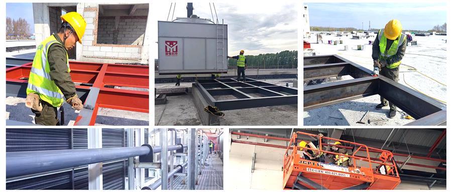 冷风机设备入场后,项目部立即有序开展焊接吊风机平台工作,完成平台焊接后,项目部合理安排进度计划,实施进度管理。经过项目部全体人员的连续奋战,项目4号库12台冷风机已顺利安装到位,管道安装完成80%;1号库完成4台蒸发式冷凝器安装工作,下一步进行管道安装。
