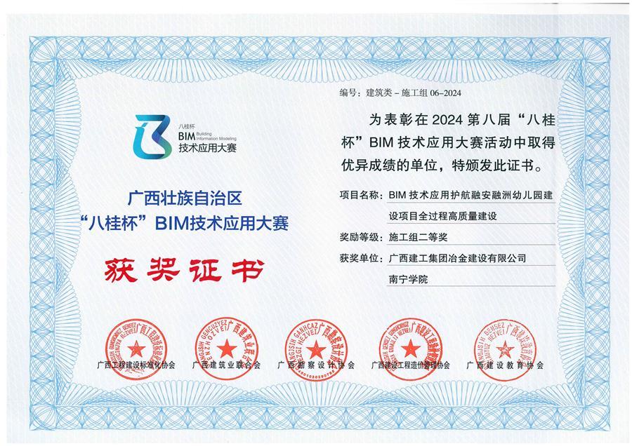 12月30日,冶建公司基础分公司收到广西第八届“八桂杯”BIM技术应用大赛荣获施工组建筑类二等奖的获奖证书。这是基础分公司创优工作的又一硕果。据统计,2024年该分公司在BIM技术方面荣获国家级奖3项,区级八桂杯二等奖1项;QC成果荣获国家级QC成果4项,部级QC成果3项,区级QC成果15项。