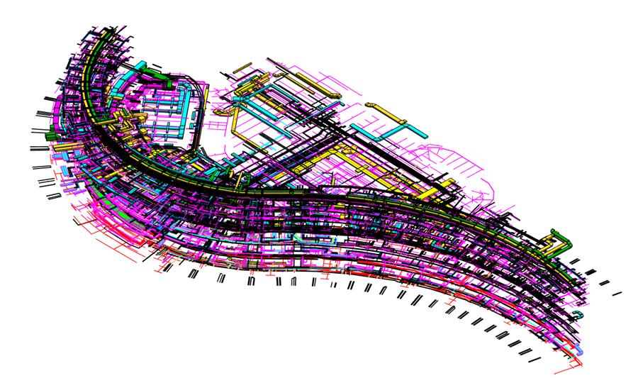 其中BIM机电深化设计为项目带来了巨大的经济效益。通过建立BIM模型,在模型中进行管线综合排布、净高优化、机房深化设计等,发现并解决设计图纸中存在的错误,然后进行碰撞检查,优化管线走向,提高楼层净高,最终导出深化后的BIM模型与CAD图纸,两者相结合对现场施工人员进行交底,指导现场施工。
