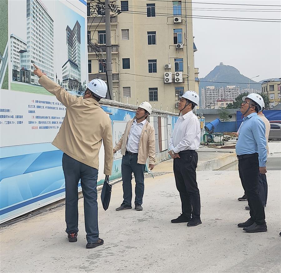 10月12日,冶建公司总经理、党委副书记蒙胜益率队到桂金分公司承建的河池市宜州区中医医院老年病诊疗康复楼工程总承包项目实地调研,并在广西冶建桂聚鑫建筑工程有限公司主持召开工作座谈会。公司副总经理唐峰参加。