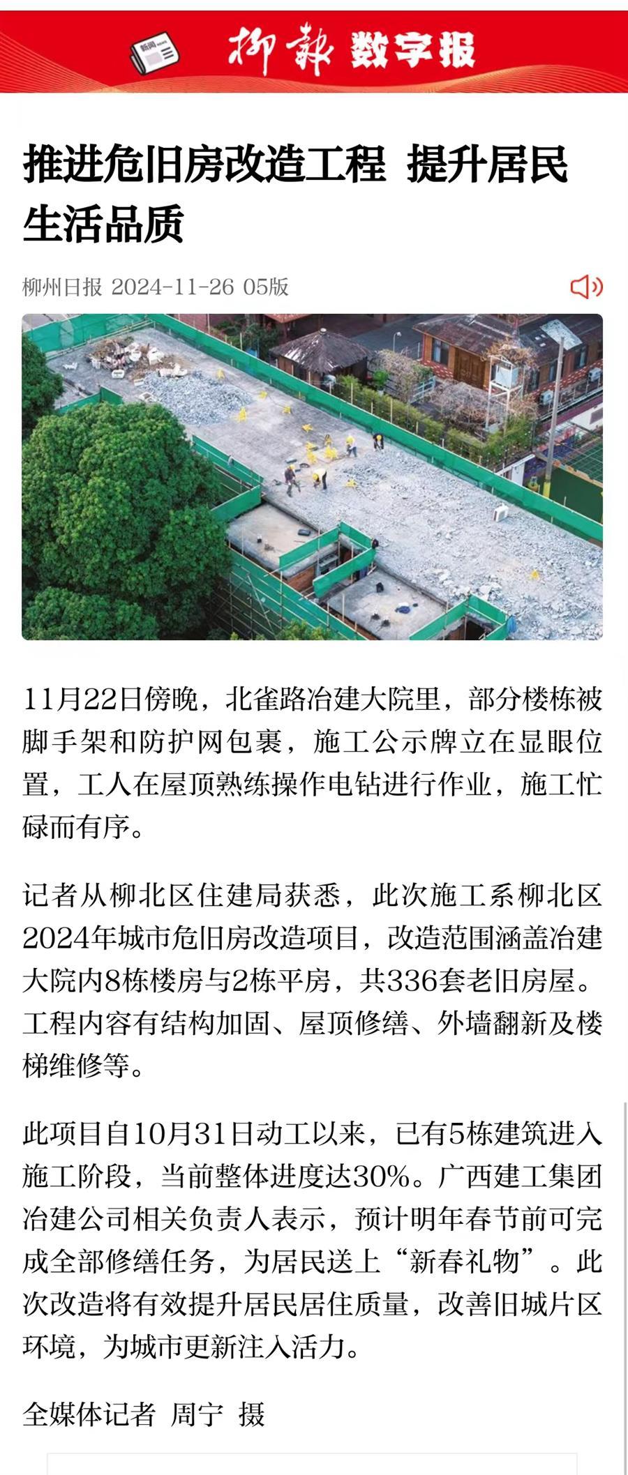 11月25日,《柳州日报》五版以《推进危旧房改造工程 提升居民生活品质》为题,图文并茂的形式报道了冶建大院危旧房改造项目顺利推进的情况。