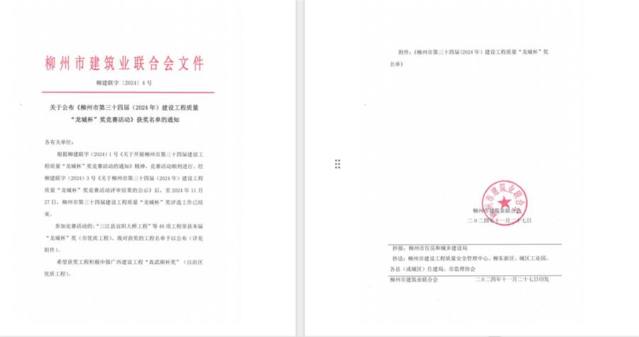 11月28日,柳州市建筑业联合会公布柳州市第三十四届(2024年)建设工程质量“龙城杯奖”竞赛活动获奖名单和2024年柳州市建设工程优质结构奖名单,由冶建公司承建的三江县宜阳大桥工程等4项工程荣获“龙城杯”奖;柳州市柳东新区明德小学项目(一期)等2项工程获柳州市“优质结构奖”。
