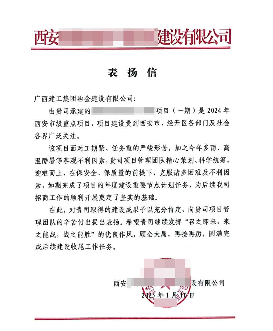 新年伊始,喜讯传来!近日,冶建公司收到远在千里之外的项目业主寄来一封《表扬信》,信中对冶建基础分公司承建项目的管理水平高、建设速度快、工程质量优“点赞”,向全体项目管理人员的辛苦付出提出表扬,对公司取得的建设成果予以充分肯定。