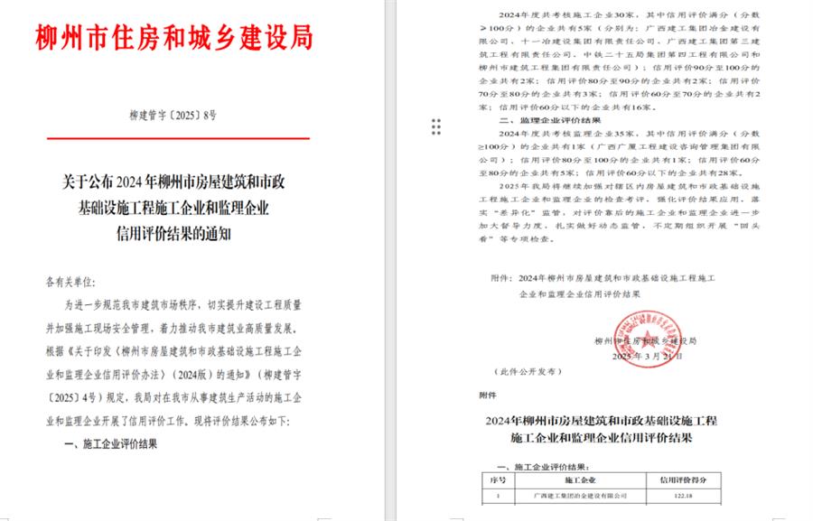 近日,柳州市住房和城乡建设局发布《关于公布2024年柳州市房屋建筑和市政基础设施工程施工企业和监理企业信用评价结果的通知》(柳建管字〔2025〕8号),冶建公司以122.18分的优异成绩,位列柳州市施工企业信用评价榜首,彰显了公司在工程质量、安全管理及市场信誉等方面的卓越实力。