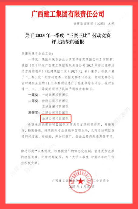 4月23日,集团公司工会通报2025年一季度“三赛三比”劳动竞赛评比结果,冶建公司项目团队在11个建安企业参赛项目中荣获三等奖,彰显了项目团队务实高效、团结协作、拼搏进取的精神风貌。