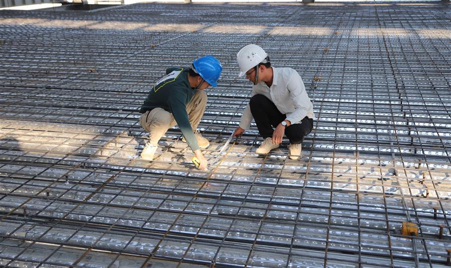 11月5日,工作人员在检查已扎好的钢筋网情况。