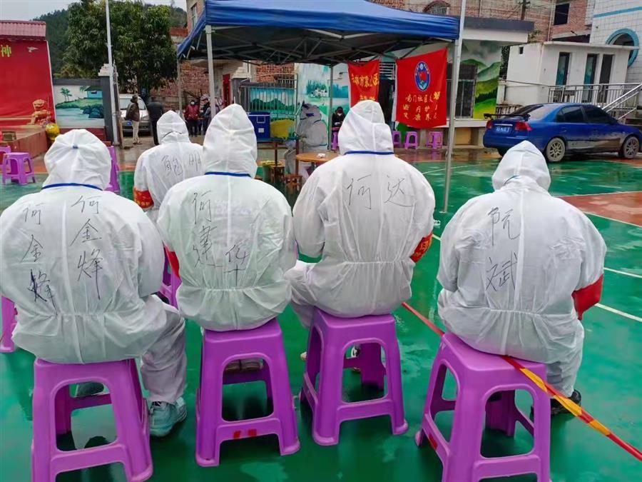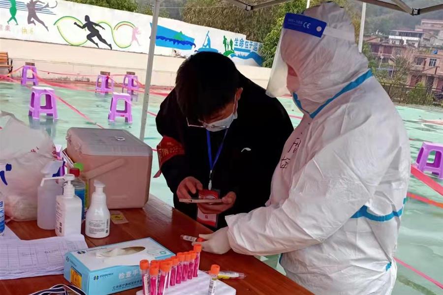 2月7日,阮斌在百色市田东县印茶镇那板村六内屯青年志愿者队参加志愿者工作。他每天除了协助医务人员进行核酸检测,还要与其他志愿者在村口站岗,仔细检查每一位村民的两码并测量体温。遇到不配合工作的老人,他还会耐心解释当前疫情防控政策,劝说他们不要离乡走动,配合防疫工作人员做好疫情防控工作。不站岗时,阮斌会和其他青年志愿者一起上门宣传疫情防护知识,帮助村民做核酸检测前的信息录入。有些老人不会使用手机,阮斌便耐心将操作流程演示给老人看,再让老人自行操作一次,遇到老人忘记操作的步骤时,阮斌会一次又一次地演示,直到老人可以记住全部操作流程。