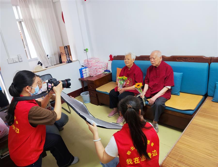 “我们结婚近七十年了,这张照片很珍贵,我要放在客厅最显眼的地方。”韦爷爷捧着照片笑容满面地说道。他的老伴也说道:“孩子们常年在外工作,你们来看望我们又给我们拍照,心里特别暖。”