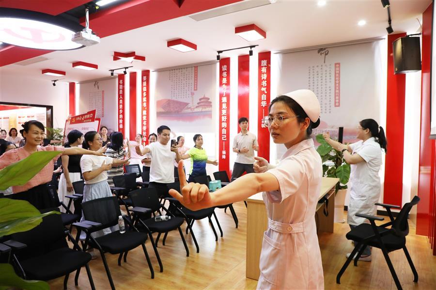 随后,蒋芳幸医生现场示范八段锦经典动作,逐一讲解要领及养生功效。职工们跟随练习,在医生指导下逐渐掌握动作规范,切身感受传统功法的养生魅力。